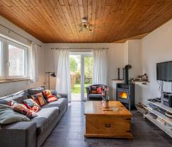 Das Ferienhaus punktet nicht nur mit seiner praktischen und funktionalen Einrichtung, sondern auch mit einigen Wellness-Extras, die einen entspannten, erholsamen Urlaub versprechen. Die Sauna und das skandinavische Badefass im Außenbereich laden nach einer langen Wanderung zum Relaxen ein. Bei schönem Wetter werden Sie im Garten sicher viel Zeit verbringen. Hier genießen Sie eine hübsche Aussicht auf die ländliche Umgebung und verfügen über 2 Terrassen mit Gartenmöbeln. Nicht weniger sympathisch zeigt sich das Interieur des Hauses mit seinem großen offenen Wohnbereich, in dem sich Wohn-, Esszimmer und Küche befinden. Schöne gemeinsame Momente mit der Familie, beim Aperitif oder bei einem leckeren Essen, sind hier garantiert. Schließlich verfügen Sie in diesem eingeschossigen Haus über 2 Schlafzimmer und 1 Badezimmer.