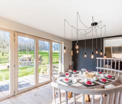 Im Erdgeschoss befinden sich die Eingangshalle und eine gut ausgestattete Küche. Hier gibt es auch eine kleine Stehtischecke mit Hockern. Ein paar Stufen führen hinunter ins freundliche Esszimmer, wo Sie auf der maßgefertigten Sitzbank am Esstisch Platz nehmen und den wundervollen Blick nach draußen genießen können.