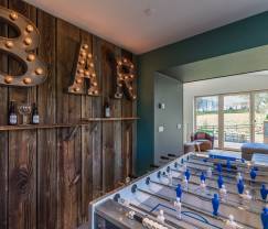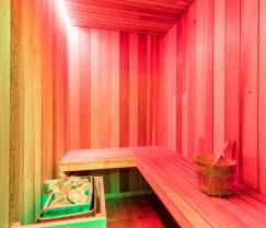 Von hier aus geht es über die Treppe hinauf ins Wohnzimmer, das sowohl Zugang zum Hobbyraum mit Kickertisch als auch zum Wellnessbereich bietet, der mit einer Sauna, einem Dampfbad, einer Dusche und einem separaten WC ausgestattet ist.