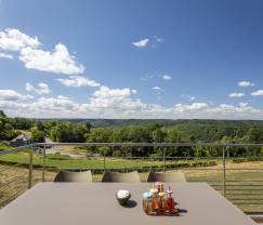 Die Terrasse, der Garten und das Outdoor-Jacuzzi haben Talblick. Das Gleiche gilt für die Gemeinschaftsbereiche: Eine große Fensterfront lässt Licht und Natur herein, so dass hier ein wahres Panorama-Wohnzimmer entsteht. Der Ausblick ist zu jeder Jahreszeit und bei jedem Wetter ein Traum: wenn sich die Wälder herbstlich färben, an einem nebligen Morgen, wenn die ersten Sonnenstrahlen wie im Märchen das Grün erstrahlen lassen, oder auch im Winter, wenn ein weißer Mantel die Landschaft bedeckt. Schon jetzt ist klar: Sobald man einmal hier auf dem Sofa sitzt, will man nicht wieder weg... Wer könnte es einem verübeln?