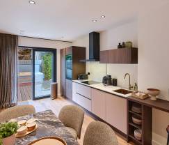 Neben der Privatterrasse gibt es auch einen Entspannungsraum mit u.a. einem Kicker, wo man zur Ruhe kommen kann. Für die Sportlichen ist eine Fahrradabstellmöglichkeit vorhanden, und wenn man mit einem Elektrofahrzeug kommt, kann man die Ladestation für Elektrofahrzeuge nutzen. Der Aufenthalt fühlt sich an wie ein Hotel, aber mit der ganzen Freiheit eines eigenen Hauses.