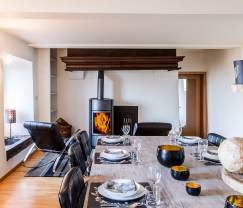 In der Fassade des Ferienhauses wurde das ursprüngliche Aussehen des ehemaligen Hofes erhalten, sobald man jedoch die Türschwelle überschritten hat, empfängt Sie eine wunderschöne Inneneinrichtung, die von modernen architektonischen Merkmalen geprägt ist. Über die Diele erreicht man verschiedene Räume im Erdgeschoss, insbesondere die große Leseecke mit einem umfassenden Angebot an Büchern und einem TV-Gerät, eine große und besonders gut ausgestattete Küche, einen Bereich mit Esszimmer und im Hintergrund ein Holzofen für behagliche Wärme sowie eine Spielecke für die Kleinen.